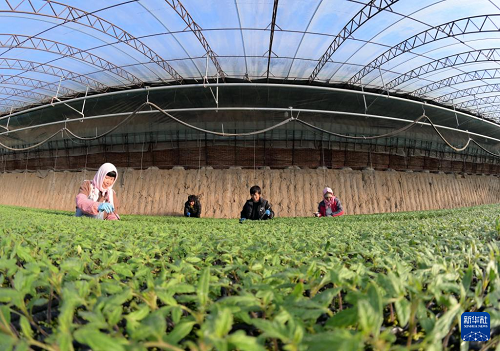 1月5日,河北省唐山市曹妃甸区第六农场曾家湾三村的农民在育苗棚内管护西红柿秧苗。(新华社记者 杨世尧 摄)