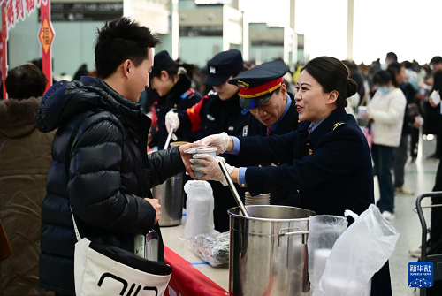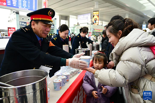 1月6日,在合肥南站候车大厅,工作人员将腊八粥送给旅客。(新华社记者 周牧 摄)