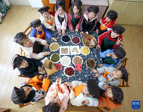 1月6日,江苏省常州市钟楼区科技实验幼儿园的小朋友们参加“识五谷 迎腊八”活动。(新华社发 陈暐 摄)