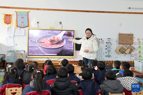 1月6日,在江苏省淮安市洪泽湖幼儿园,老师为小朋友们讲解制作腊八粥食材的知识。(新华社发 殷潮 摄)