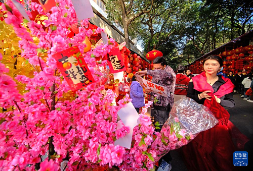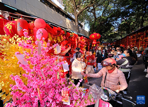 随着春节的临近,广西南宁市交易场附近的新春饰品摊位生意日益红火,众多市民前来采购春联、窗花等新春饰品。