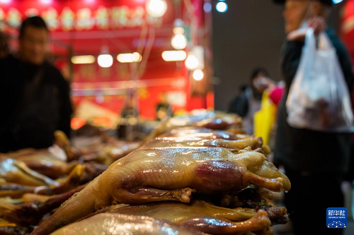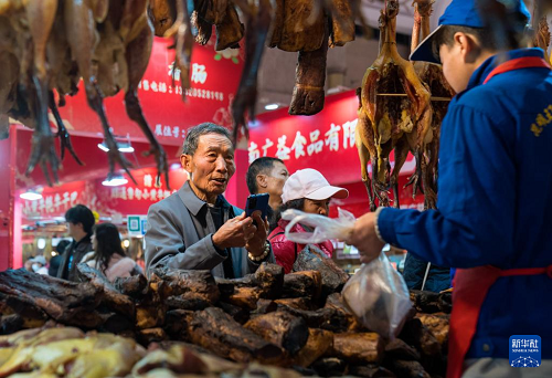 1月14日,顾客在昆明滇池国际会展中心购买肉类腌制品。(新华社发 彭奕凯 摄)