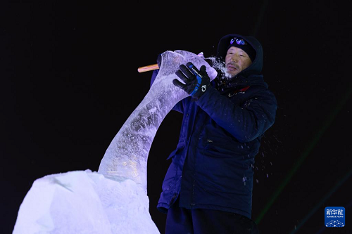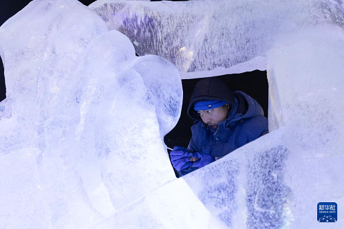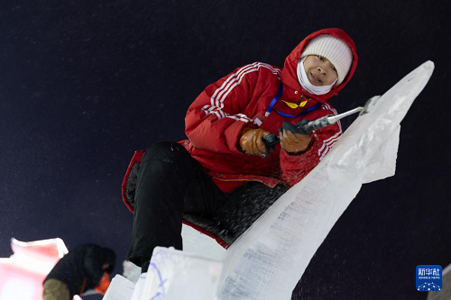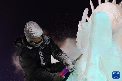 1月15日,参赛选手在哈尔滨冰雪大世界园区进行冰雕创作。(新华社记者 张涛 摄)