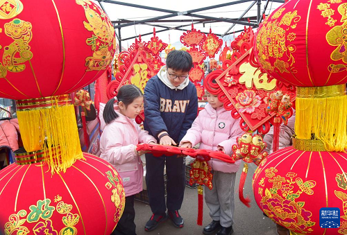 1月23日,在山东省临沂市郯城县郯城街道十里年集上,顾客带孩子选购春节饰品。(新华社发 张春雷 摄)