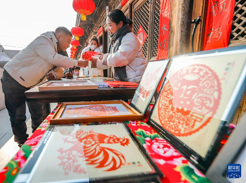 1月23日,人们在河北省遵化市团瓢庄镇山里各庄村的集市上选购剪纸饰品。(新华社发 刘满仓 摄)