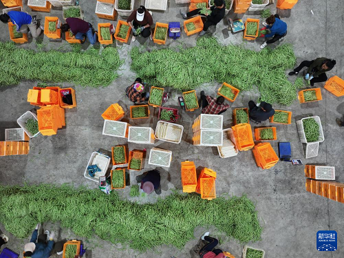 1月25日,云南省景洪市勐罕镇一家蔬菜公司,工人分拣豆角(无人机照片)。(新华社发 李云生 摄)