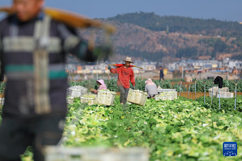 春节将至,云南各地农民忙着采收、装运蔬菜和水果,源源不断供应国内各地节日市场,丰富了市民的“菜篮子”和“果篮子”。