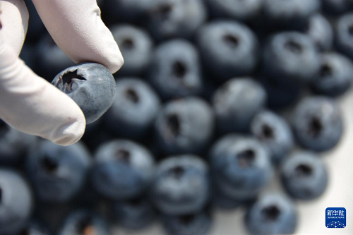 1月25日,在云南省红河哈尼族彝族自治州蒙自市草坝镇缤纷农业示范基地的蓝莓种植基地,当地农户采收、分拣新鲜蓝莓。(新华社发 薛莹莹 摄)