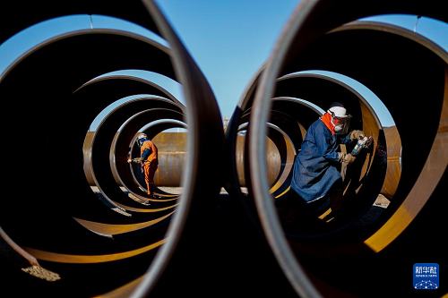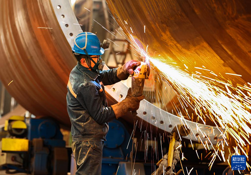 2月5日,江苏省连云港经济技术开发区一家风力设备公司工人在车间内生产风电塔架。(新华社发 王健民 摄)