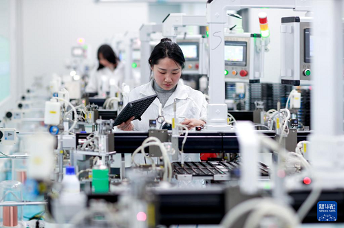 2月7日,工作人员在江苏省兴化市陈堡镇的江苏华能电子有限公司自动化生产线旁忙碌。(新华社发 周社根 摄)