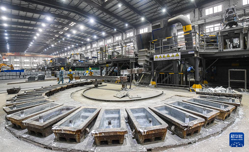 2月7日,在湖南省常宁市水口山经济开发区,湖南株冶有色金属有限公司熔铸车间工人在生产作业。(新华社发 周秀鱼春 摄)