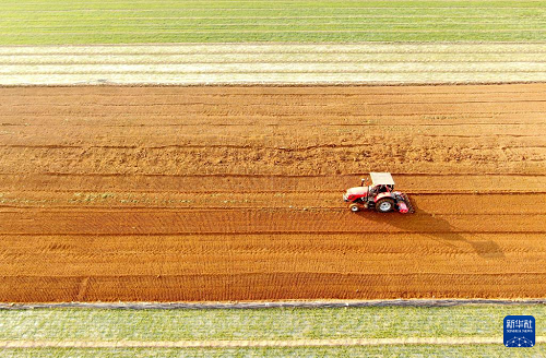 2月4日,山东省临沂市平邑县地方镇农民驾驶农机在翻耕农田(无人机照片)。(新华社发 武纪全 摄)