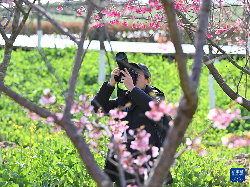 2月9日,参观者在霞浦县玉潭樱花谷生态科技园拍照。(新华社记者 姜克红 摄)