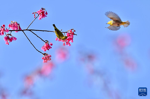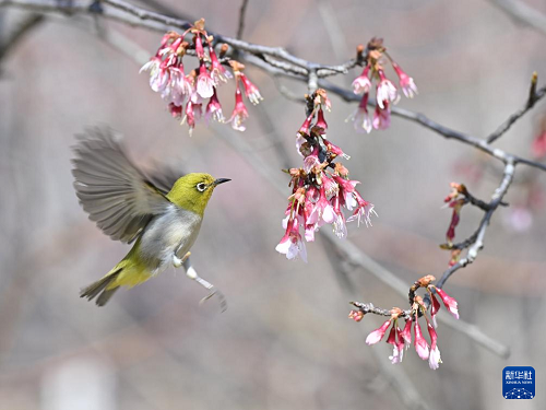 2月9日,绣眼鸟在霞浦县玉潭樱花谷生态科技园觅食樱花蜜。(新华社记者 姜克红 摄)