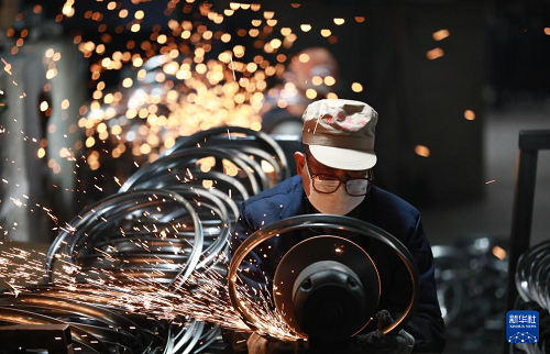 2月11日,在浙江省杭州市临安区天目山镇一家外贸企业,工人在对准备销往海外的自行车钢圈进行抛光作业。(新华社发 胡剑欢 摄)