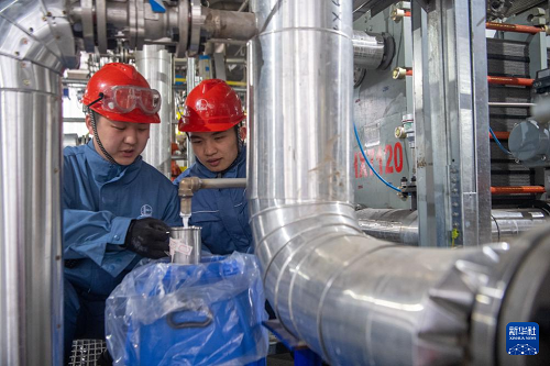 2月11日,在重庆市长寿区的中国石化川维化工VAE(醋酸乙烯-乙烯共聚乳液)项目,工作人员在进行产品采样。(新华社记者 唐奕 摄)