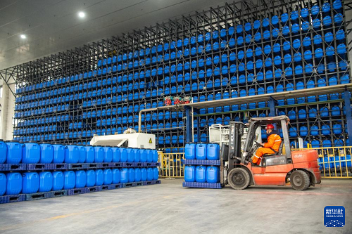 2月11日,在重庆市长寿区的中国石化川维化工VAE(醋酸乙烯-乙烯共聚乳液)项目,工作人员在转运产品。(新华社记者 唐奕 摄)