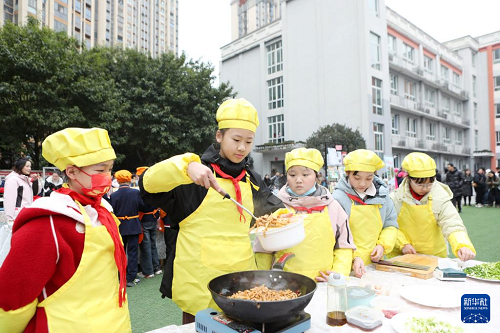 2月16日,在重庆市永川区红专小学,学生们参加“第三届生活节暨读书节”中的烹饪比赛,迎接新学期。(新华社发 陈仕川 摄)