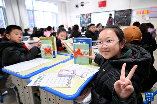 2月16日,宁夏银川市兴庆区实验二小学生在展示领到的新课本。(新华社记者 王鹏 摄)