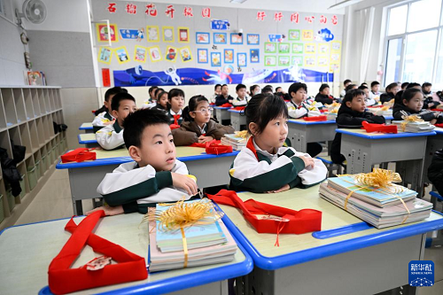 2月16日,宁夏银川市金凤区第一小学学生在教室里准备领取新课本。(新华社发 袁宏彦 摄)
