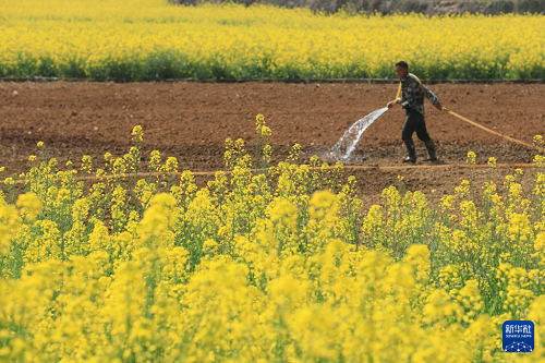 2月17日,在云南省腾冲市中和镇樊家营村,村民正在给新种植的荞麦浇水。(新华社发 龚祖金 摄)