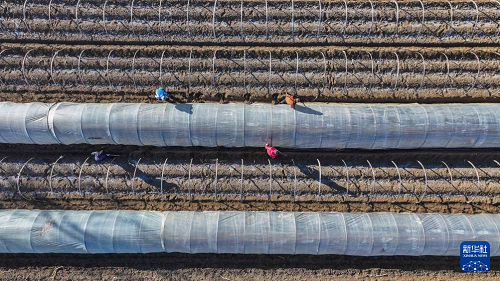 2月17日,农民在河北省遵化市一家蔬菜种植基地搭建暖棚,准备播种春季马铃薯(无人机照片)。(新华社发 刘满仓 摄)
