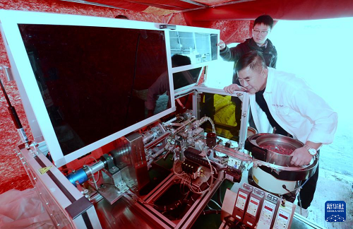 2月19日,大兴区老宋瓜果专业合作社负责人宋绍堂(前)在调试新引进的智能嫁接设备。(新华社记者 李欣 摄)