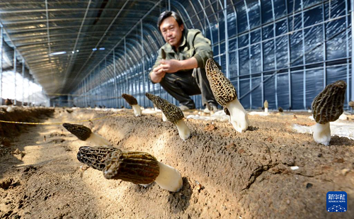 2月19日,北京大兴区庞各庄镇聚棒羊肚菌农场的技术人员在观测羊肚菌长势。(新华社记者 李欣 摄)