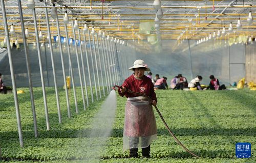 2月19日,农民在大兴区庞各庄镇一育苗大棚内工作。(新华社记者 李欣 摄)