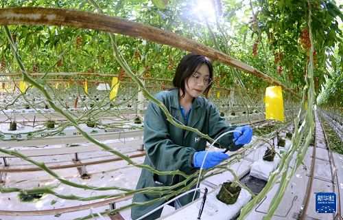 2月19日,技术人员在宏福农业大兴园区的智能温室中检测智能节水管道。(新华社记者 李欣 摄)