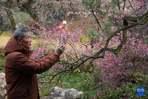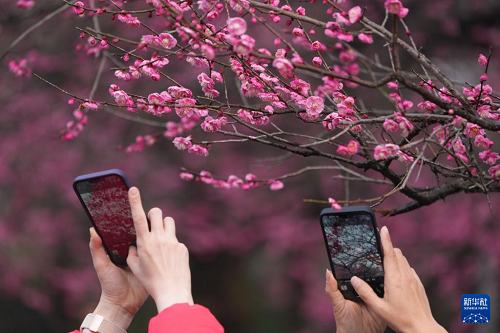 2月23日,游人在灵峰山下拍摄梅花。(新华社记者 翁忻旸 摄)