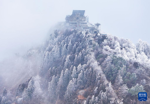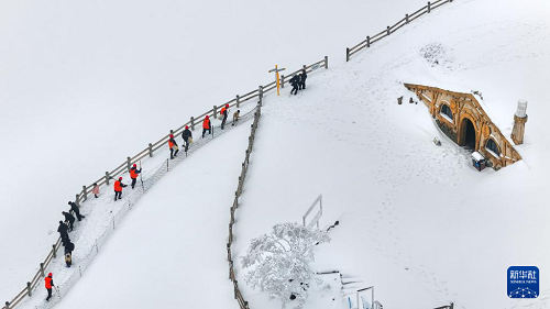 2月24日,游客在湖南省衡阳市南岳衡山风景区游玩赏雪(无人机照片)。(新华社发 曹正平 摄)