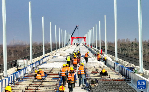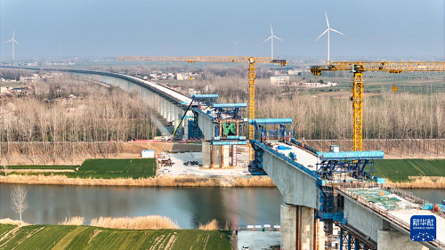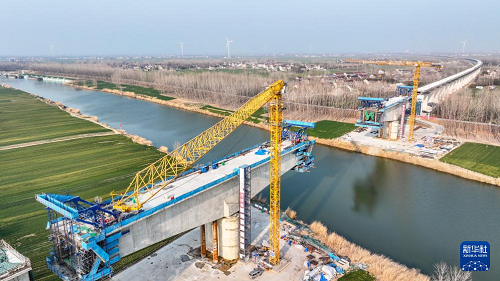 2月25日拍摄的中铁四局阜淮铁路跨涡河特大桥连续梁施工现场(无人机照片)。(新华社发 刘玉才 摄)