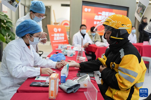 3月5日,医务志愿者在浙江省宁波市北仑区新碶街道茉莉社区党群服务中心为网约送餐员、快递骑手免费体检。(新华社记者 黄宗治 摄)