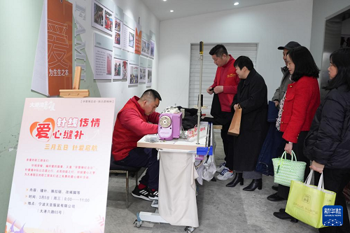 3月5日,浙江省宁波市北仑区新碶街道大港工业社区“针爱”缝补队志愿者为群众提供衣裤改长短、换拉链、钉纽扣等服务。(新华社记者 黄宗治 摄)