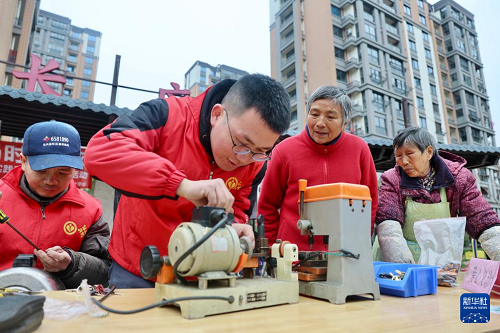 3月5日,青年志愿者在浙江省湖州市长兴县太湖图影山湖花园社区为辖区居民提供免费配钥匙服务。(新华社发 吴拯 摄)