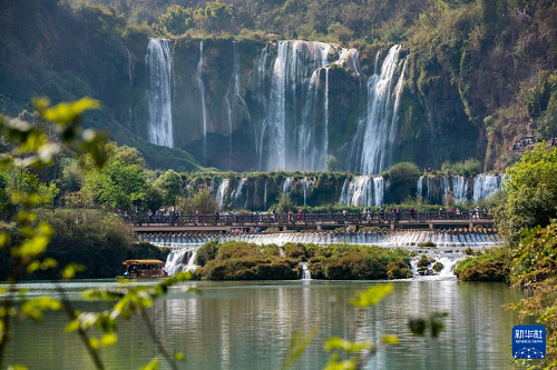 3月10日,游人在云南省曲靖市罗平九龙瀑布群风景区游览。(新华社发 彭奕凯 摄)