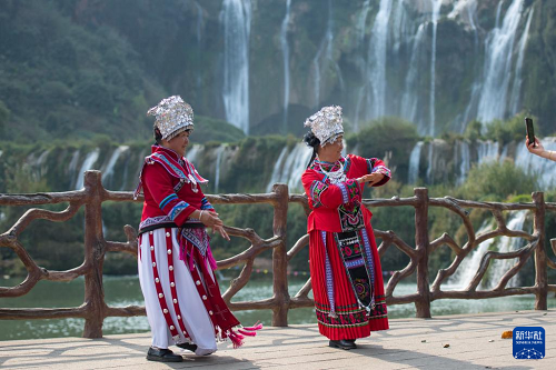 3月10日,游人在云南省曲靖市罗平九龙瀑布群风景区拍照。(新华社发 彭奕凯 摄)