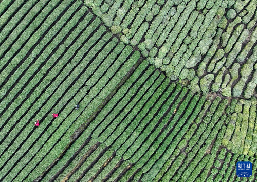 3月10日,茶农在新昌县东茗乡下岩贝村采摘新茶(无人机照片)。(新华社记者 翁忻旸 摄)