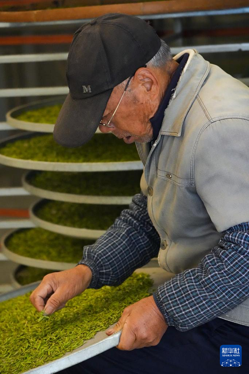 3月10日,在新昌县东茗乡下岩贝村的一家茶叶加工厂,工作人员在挑拣茶叶。(新华社记者 翁忻旸 摄)