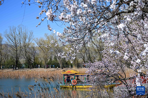3月16日,游客在北京颐和园乘船赏花游玩。(新华社记者 张铖 摄)