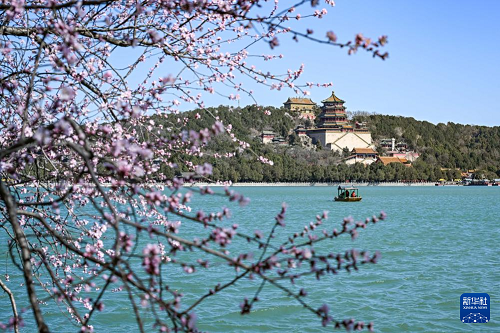 3月16日,游客在北京颐和园踏青赏花。(新华社记者 张铖 摄)