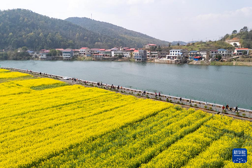 3月16日,在湖南省娄底市双峰县杏子铺镇涟水村,游客畅游花海(无人机照片)。(新华社发 吴永华 摄)