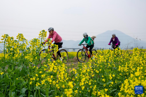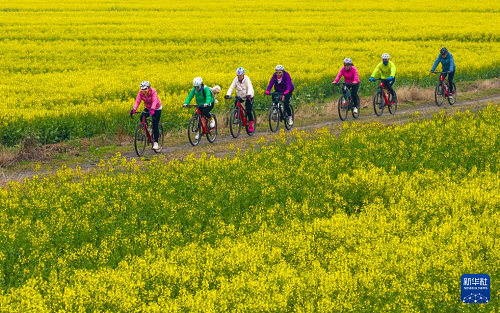 3月16日,骑行爱好者在安徽省芜湖市繁昌区峨山镇城东村的油菜花田间骑行。(新华社发 肖本祥 摄)