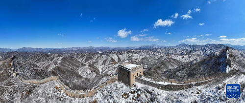 3月16日拍摄的雪后的金山岭长城(无人机全景照片)。(新华社记者 陈晔华 摄)