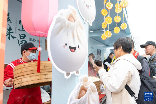 3月17日,消费者在2025年“中华美食荟”湖北宜昌摊位购买红油包子。(新华社记者 肖艺九 摄)