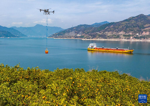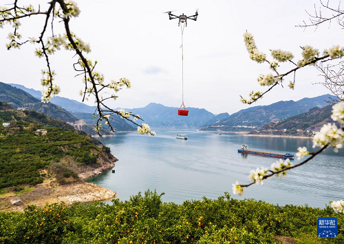 3月17日,湖北省秭归县郭家坝镇邓家坡村村民用无人机转运脐橙。(新华社发 郑家裕 摄)