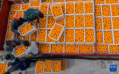 3月17日,湖北省秭归县郭家坝镇邓家坡村村民将刚收获的脐橙装车外运(无人机照片)。(新华社发 郑家裕 摄)