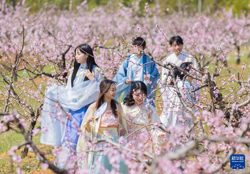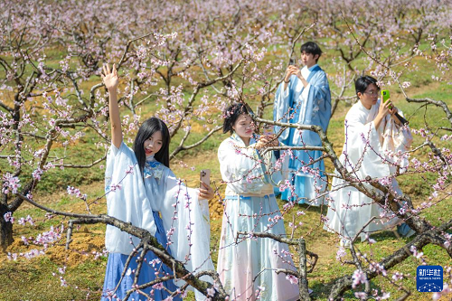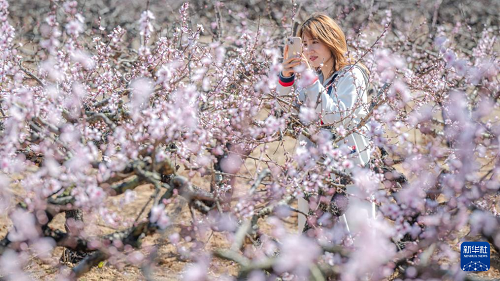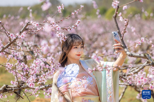 3月18日,游客在湖北省孝感市卓尔桃花驿小镇文化旅游节上赏花拍照。(新华社记者 肖艺九 摄)