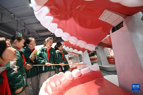 3月20日,陕西省西安市新城区通济坊小学的学生在西安交通大学口腔医院口腔科普教育基地了解口腔健康知识。(新华社记者 李一博 摄)